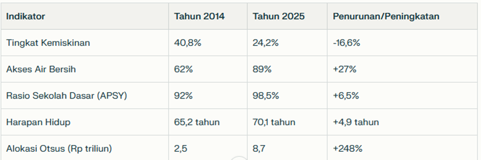 A. Pemerintah Indonesia telah mengalokasikan Dana Otonomi Khusus (Otsus) secara masif untuk kesejahteraan Papua. Pembangunan Signifikan di Papua Dimana Pemerintah Indonesia telah menggelontorkan triliunan rupiah melalui Dana Otonomi Khusus (Otsus) sejak 2002. Hasilnya? Tingkat kemiskinan di Papua turun dari 40,8% (2014) menjadi 26,8% (2023), menurut data Badan Pusat Statistik (BPS). Akses pendidikan dan kesehatan juga meningkat drastis, dengan rasio sekolah dasar mencapai 98% di wilayah Papua.